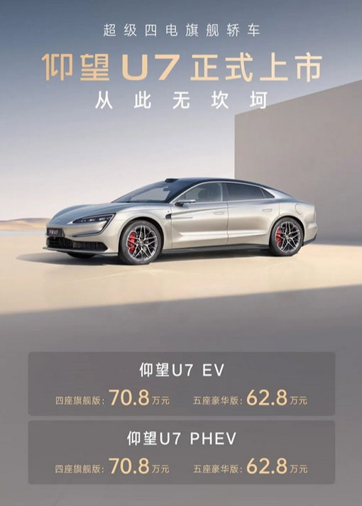 这款被誉为比亚迪最强轿车的仰望U7,自3月27日上市以来,共推出四款车型,售价区间为62.8-70.8万元。