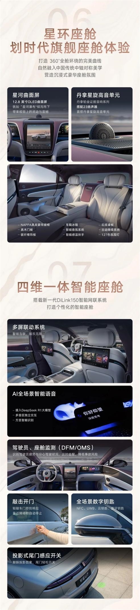 内饰沿用“星环座舱”理念设计,配备12.8英寸OLED曲面屏,搭载新一代DiLink智能网联系统,支持全场景语音助手。