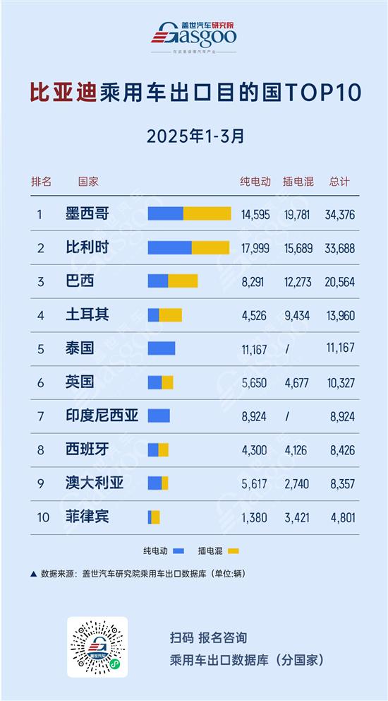 比利时。2025年1-3月,比亚迪向比利时出口纯电动乘用车1.80万辆,插电混乘用车1.57万辆,总计3.37万辆。