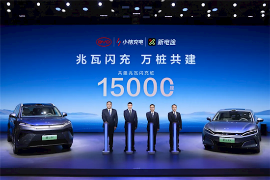 会上,比亚迪宣布与小桔充电合作共建10000座兆瓦闪充桩、与新电途合作共建5000座兆瓦闪充桩,在全国范围内推进兆瓦闪充生态普及,进一步加快兆瓦闪充充电设施的建设。