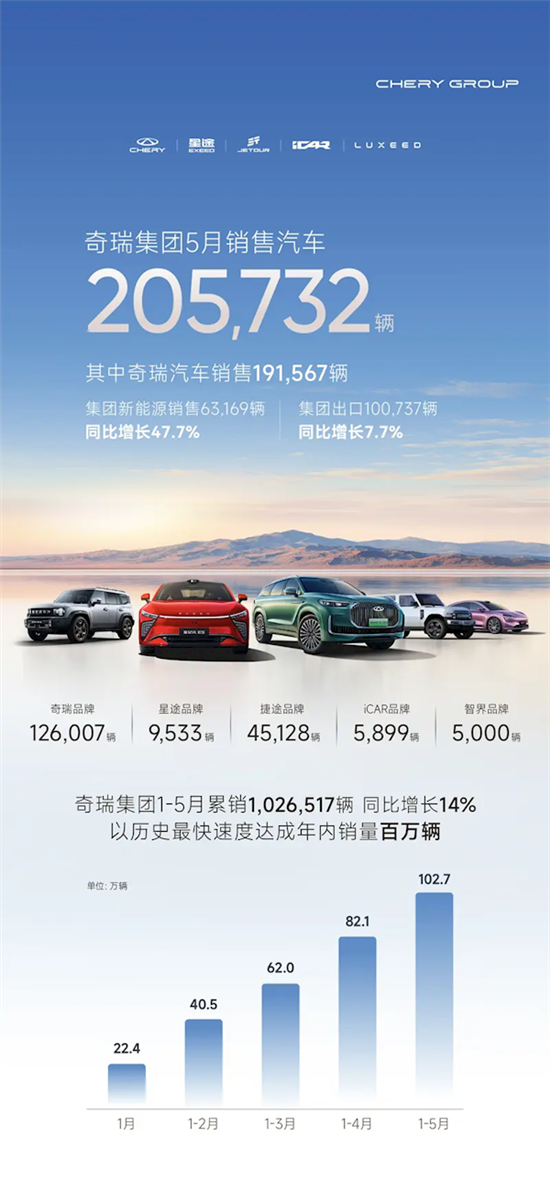 奇瑞集团在2025年5月取得了令人瞩目的销量成绩,累计销售汽车205732辆,同比增长9.1%。