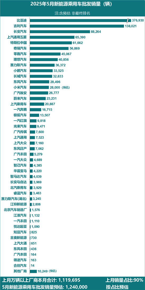 根据乘联会发布的月度初步数据综合预估,5月全国新能源乘用车厂商批发销量达到124万辆,同比增长38%,环比增长9%,展现出强劲的增长势头。