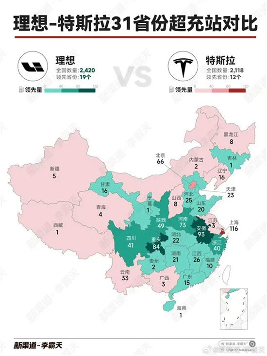 同时,硬哥贴出的“理想-特斯拉”31省份超充站对比图显示,理想在全国有19个省份领先特斯拉。