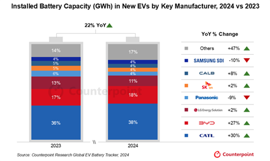 据Counterpoint最新发布的《全球新能源车电池追踪报告》显示,2024年新能源汽车新车电池装机量实现了同比22%的增长。