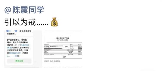 不过,因为陈震属于车圈大V,自己本身也很有实力,没过多久,他就在朋友圈晒出了自己赔偿领克500万元的打款单据,并配上了“引以为戒”的文字。