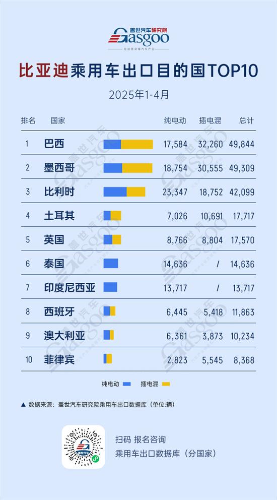 墨西哥。2025年1-4月,比亚迪向墨西哥出口纯电动乘用车18,754辆,插电混乘用车30,555辆,总计49,309辆。