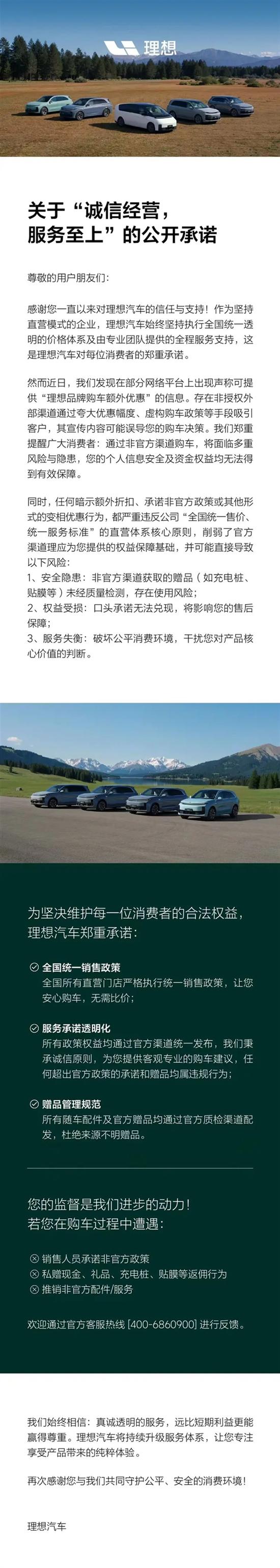 日前,理想汽车发布关于“诚信经营,服务至上”的公开承诺。