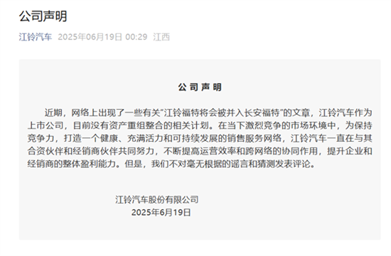 江铃汽车今日发布声明回应称,江铃汽车作为上市公司,目前没有资产重组整合的相关计划。