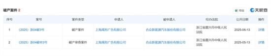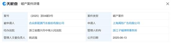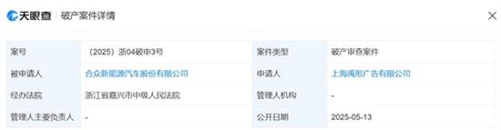 天眼查显示,哪吒汽车关联公司合众新能源汽车股份有限公司被申请破产一案更新。