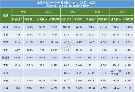 近几年来,新能源汽车行业发展迅猛,无论销量,还是营收都实现了爆发式增长,随着企业规模的不断壮大,研发投入绝对值增长便就成了自然而然的事,尤其是近两年汽车智能化技术迭代速度明显加快,车企相关的研发费用也跟着水涨船高。在上述例举的9家企业中,除开部分车企研发投入在某些年份有小幅降低之外,大部分车企2020年到2024年研发金额绝对值都实现了正向增长。