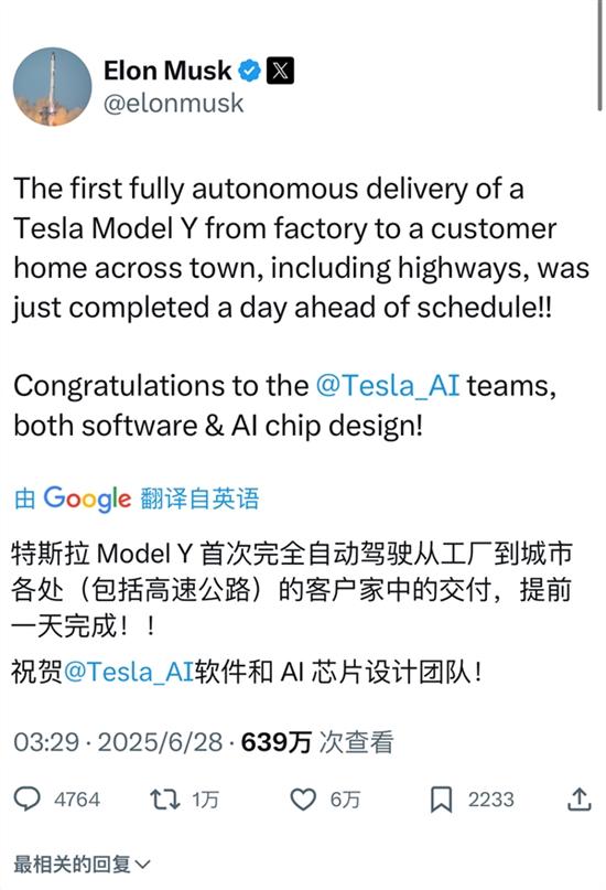 特斯拉CEO马斯克今天凌晨在X平台宣布:“首辆特斯拉Model Y已实现全自动从工厂开到客户家的交付任务,包括高速路段,而且比原计划提前一天完成!”