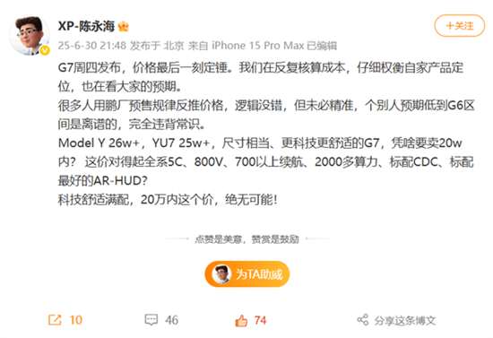 今日晚间,小鹏汽车副总裁陈永海发帖称,小鹏G7周四发布,价格最后一刻定锤。我们在反复核算成本,仔细权衡自家产品定位,也在看大家的预期。