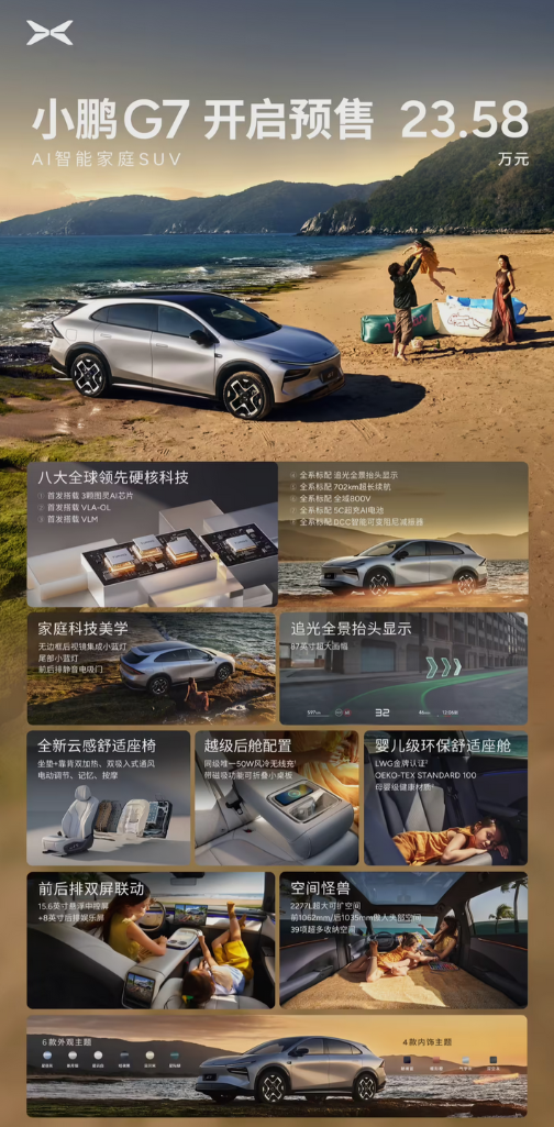 事实上,作为小鹏今年首款全新车型,且是全球首款L3级算力的AI汽车,小鹏汽车对G7也是异常重视,各项配置几乎全系拉满。
