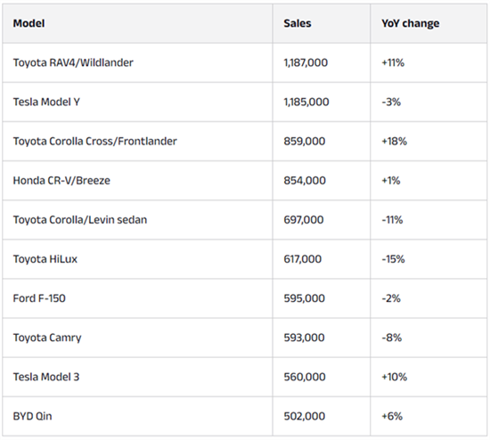 第三名则是丰田的卡罗拉锐放(锋兰达),去年卖出85.9万辆,此外,丰田的卡罗拉轿车、Hilux中型皮卡以及凯美瑞同样跻身榜单前十,对应销量分别为69.7万辆、61.7万辆和59.3万辆。