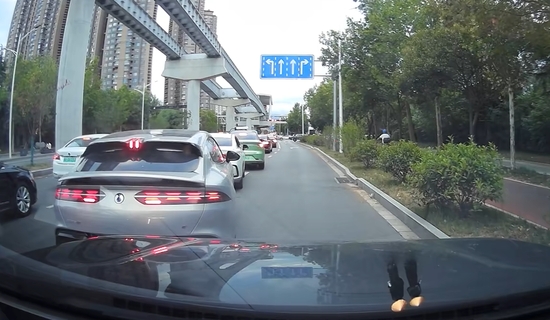 从视频来看,当时道路情况较为复杂,腾势Z9GT从右转车道变至直行车道,不过仍有一部分车身占据原来的车道,挡住了后车。而前面有车在等红绿灯,无法继续前行调整身位。