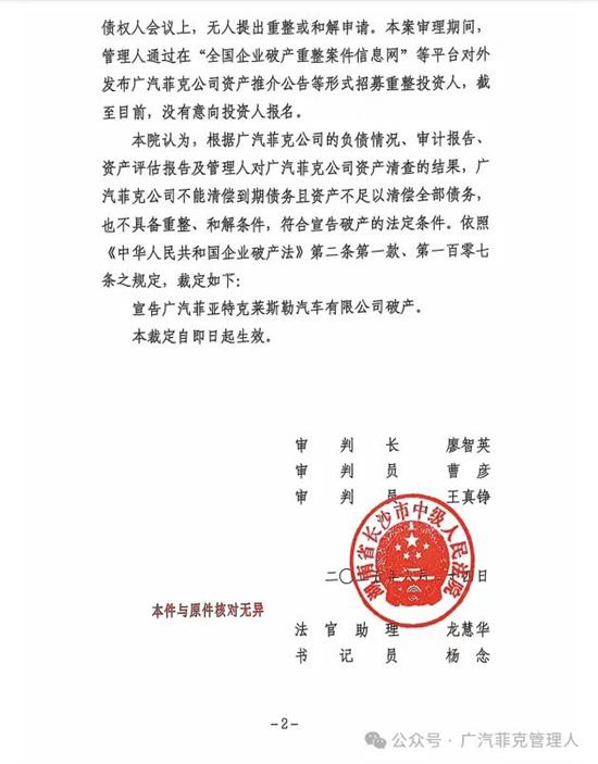 长沙中院《民事裁定书》(2022)湘01破214号-2号文件显示,根据广汽菲克公司的负债情况、审计报告、资产评估报告及管理人对广汽菲克公司资产清查的结果,广汽菲克公司不能清偿到期债务且资产不足以清偿全部债务,也不具备重整、和解条件,符合宣告破产的法定条件。依照《中华人民共和国企业破产法》第二条第一款、第一百零七条之规定,裁定如下:宣告广汽菲亚特克莱斯勒汽车有限公司破产!