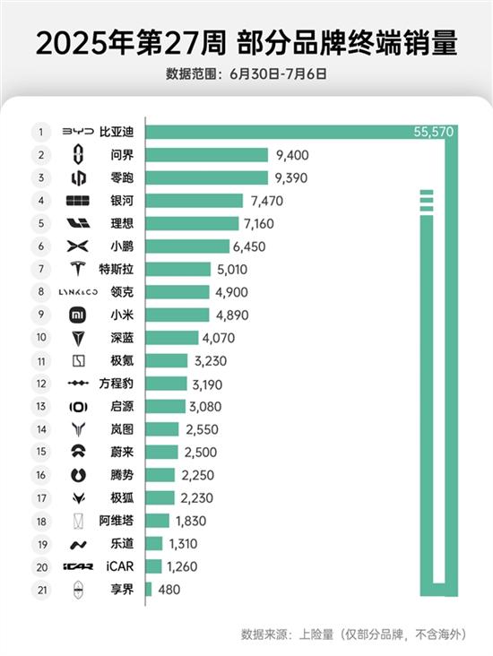 小鹏汽车卖出了6454辆,相较于上周下滑较多,同时也从第二名跌落到了第四名,不过全新G7表现亮眼,随着大规模交付开始,预计排名将有提升。