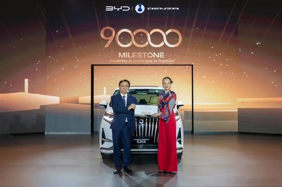 比亚迪股份有限公司董事长兼总裁王传福亲临现场,向泰国第 90000 台比亚迪汽车车主 —— 泰国足协主席伍伦盼交付了一辆腾势 D9。除此之外,比亚迪驱逐舰 05 宣布在泰国工厂下线,即将在当地上市。