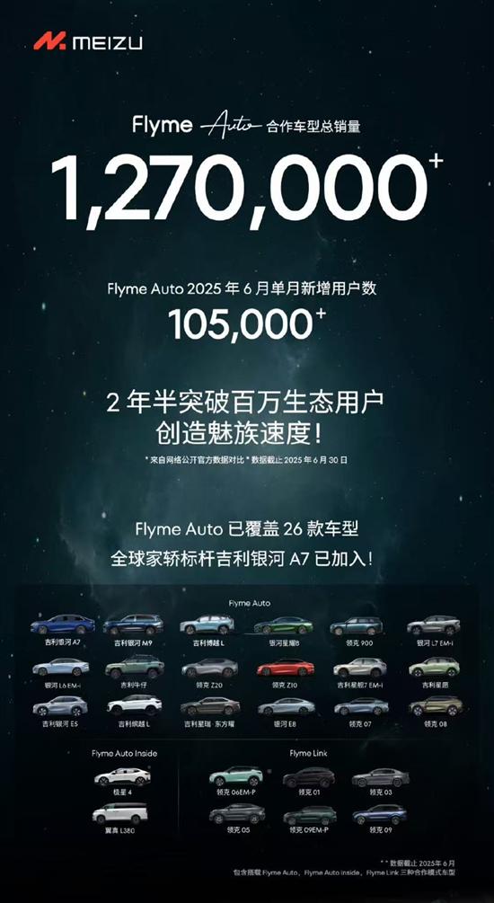 7月14日,星纪魅族宣布,截至6月30日,Flyme Auto生态用户总量突破127万,6月单月新增用户超10万。