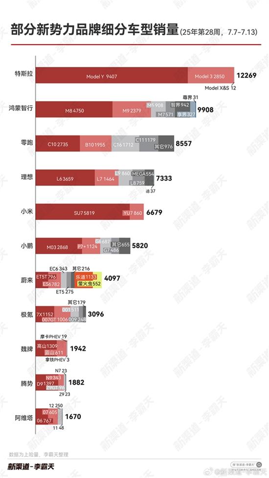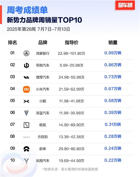 在2025年第28周,新势力品牌销量榜出炉,其中鸿蒙智行以0.99万辆的销量位列第一。