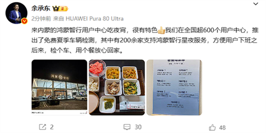 昨晚,余承东也凑了一把热闹,他发布微博称:来内蒙的鸿蒙智行用户中心吃夜宵,很有特色。