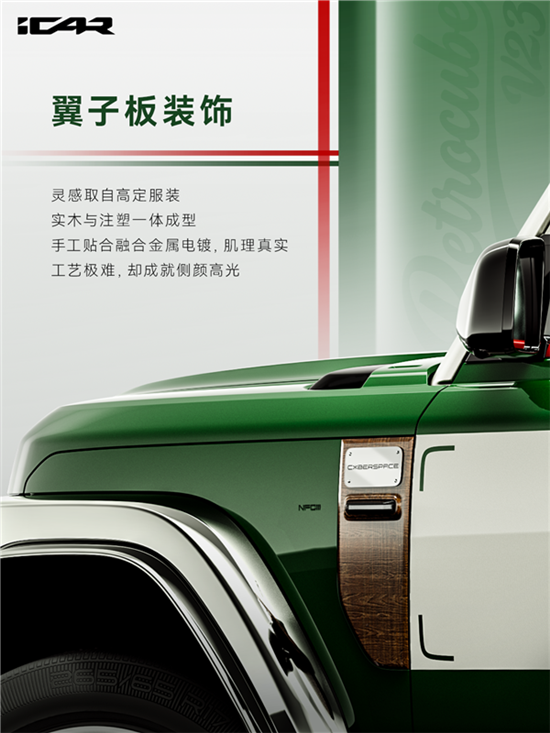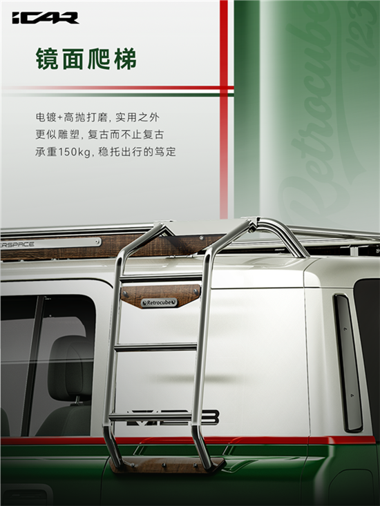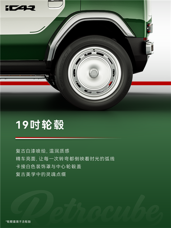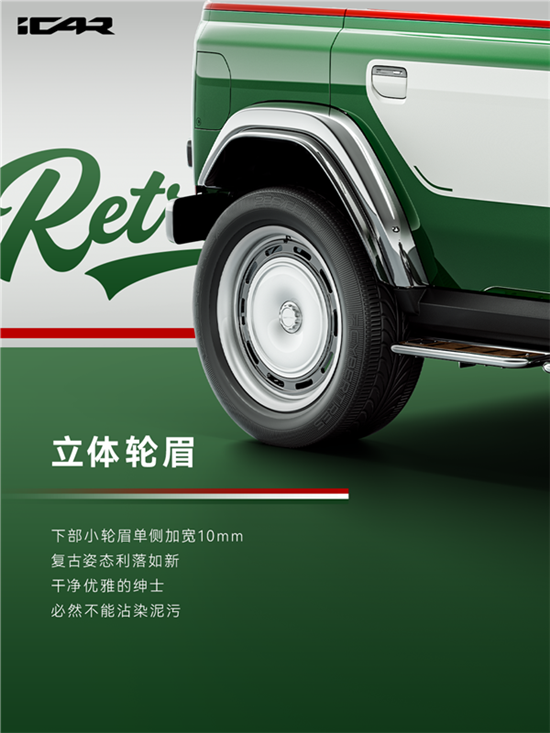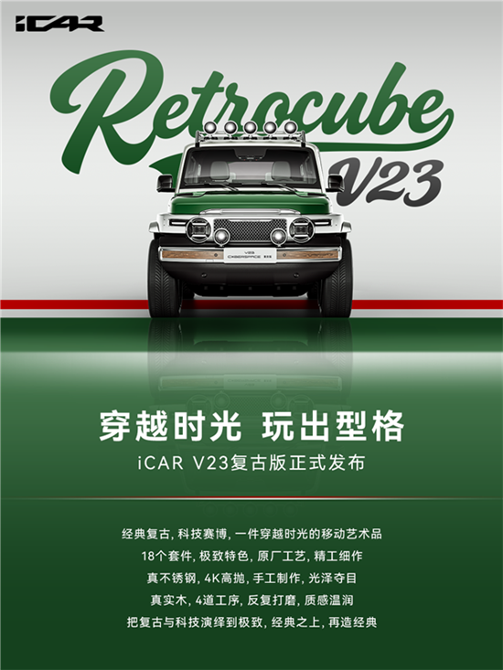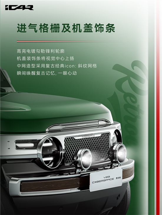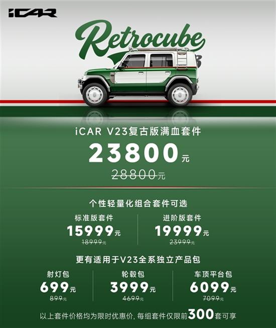 奇瑞汽车针对iCAR V23推出了复古套件,满血套件售价28800元,前300套立减5000元,共有18个套件,包含轮眉、轮毂、翼子板、射灯、侧踏等。