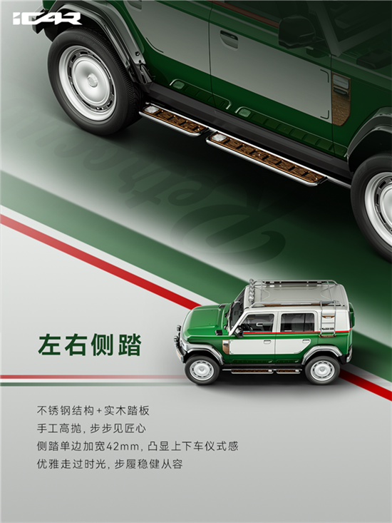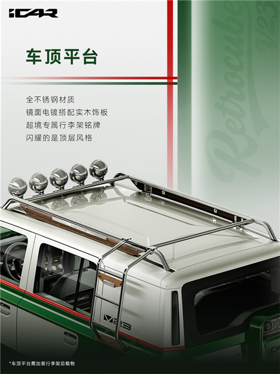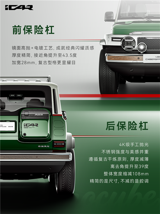 官方介绍,V23复古套件版车型的前/后保险杠和进气格栅采用了电镀高亮银不锈钢部件,搭配真实木面板侧踏,形成“电镀复刻经典,实木典藏永恒”的独特设计。