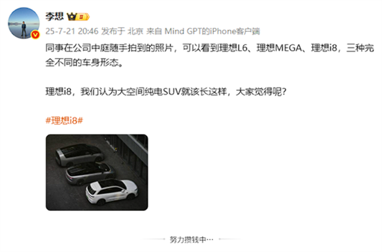 理想汽车CEO李想本人晒出了理想L6、理想MEGA、理想i8s三台车同款的照片,他表示这是三种完全不同的车身形态。