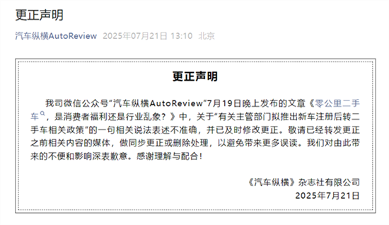 我司微信公众号“汽车纵横AutoReview”7月19日晚上发布的文章《零公里二手车,是消费者福利还是行业乱象?》中,关于“有关主管部门拟推出新车注册后转二手车相关政策”的一句相关说法表述不准确,并已及时修改更正。敬请已经转发更正之前相关内容的媒体,做同步更正或删除处理,以避免带来更多误读。我们对由此带来的不便和影响深表歉意。感谢理解与配合!