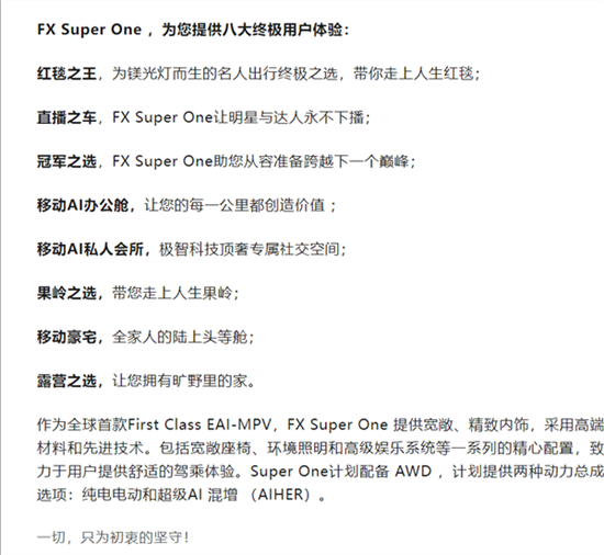 而就在这台车发布前,贾跃亭宣布,FF完成1.05亿美元的融资协议签订,融资到位后,公司预计将有充足资金来推出新车型FX Super One,并计划利用这些资金加速FF和FX品牌产品及AI相关技术的开发和交付,加速FX Super One生产交付。