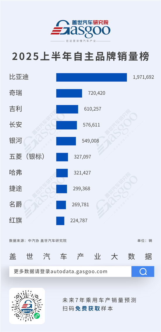 先来看2025上半年自主品牌销量榜详细数据: