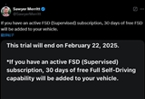 针对旧金山湾区服务,特斯拉可能启用其全自动驾驶(FSD)(监督版)功能,据悉,该功能虽可执行多项驾驶任务,但仍需人工驾驶员全程保持注意力,以便随时接管车辆。