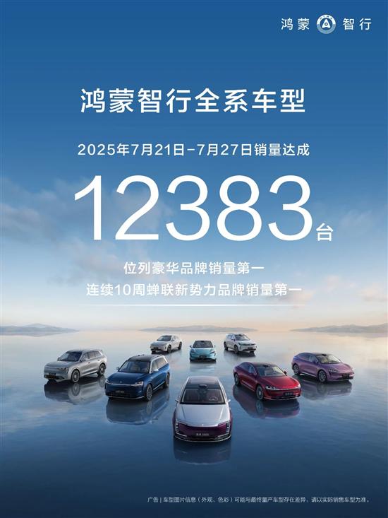 7月29日,鸿蒙智行发布最新数据,2025年第30周(7月21日-7月27日),鸿蒙智行周销量达到12383台,连续10周位列新势力品牌Top1,年度累计销量位居新势力品牌榜首。