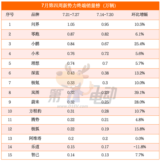 与此同时,此前长期徘徊在榜单第10名左右的岚图和蔚来正全力追赶,两者周销量均达到3200辆。值得注意的是,若将乐道和萤火虫两大品牌纳入统计,蔚来公司整体周销量可达5000辆,足以跻身新势力榜单第六位。
