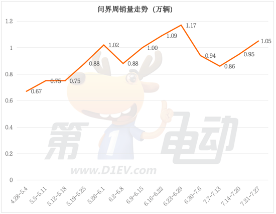 问界凭借旗下M8、M9的持续热销,周销量再度突破万辆大关,稳稳占据新势力榜首位。作为主销车型的问界M8,周销量不负众望,再次突破5000辆,达到5600辆,成为拉动品牌销量的核心力量。不过,与 M8 的火热形成鲜明对比的是,问界M9 周销量环比有所下滑,仅2100辆。值得期待的是,随着纯电版问界M8将于8月份上市,问界的销量有望再攀新高,迎来新的增长契机。