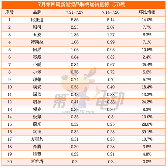 在新能源品牌榜中,前20品牌周销量均实现上涨。其中,银河、小鹏、启源、岚图和蔚来周销量环比大涨超20%。