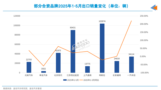 2025年1-5月,光束汽车、长安福特、北京现代、悦达起亚等品牌整体销售回暖明显,主要驱动因素是出口业务。