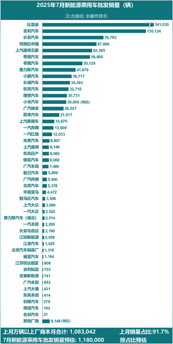 乘联分会2025年7月新能源乘用车批发销量榜单新鲜出炉。