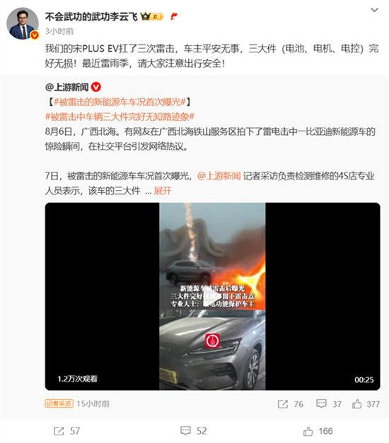 比亚迪品牌及公关处总经理李云飞今日在微博表示,该车辆遭多次雷击后安然无恙,车主平安无事,三电系统完好无损。