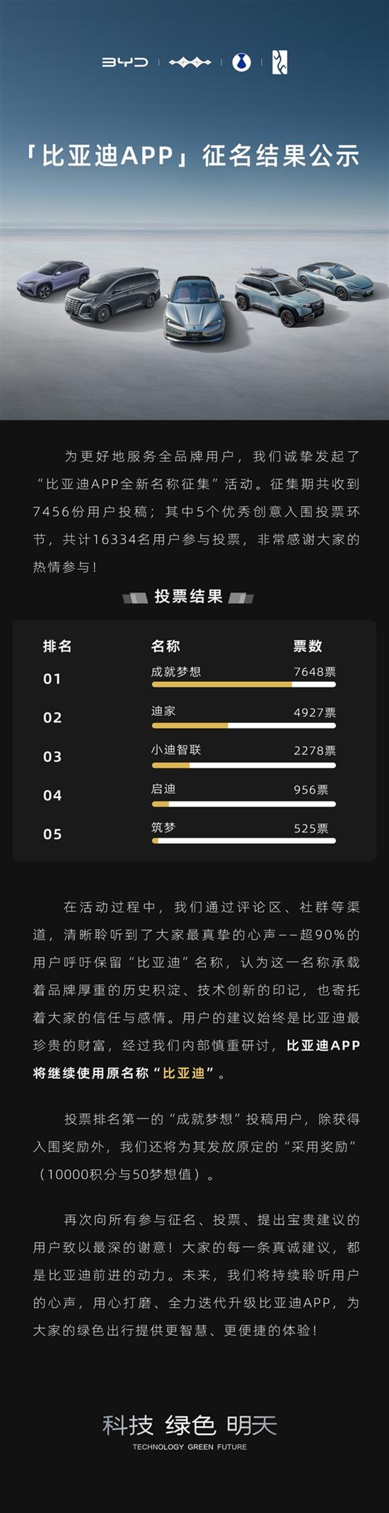 历时21天,比亚迪App合并后发起的全新名称投票已经于7月 31 日截止,其中“成就梦想”以7648票当选第一。