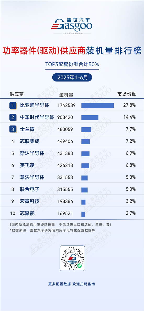 士兰微,2025年上半年装机量480,059套,市场份额7.7%。