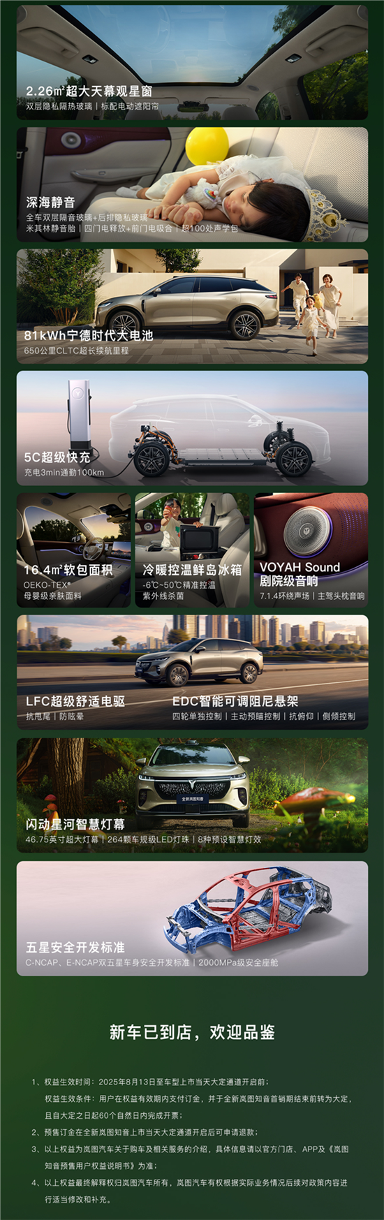 四座座椅通风/加热/无级电调、四门电释放+前排电吸门、四门6mm双层隔音玻璃+后排隐私玻璃、VOYAH Sound剧院级音响系统、81 kWh宁德时代大电池、5C超级快充、冷暖控温鲜冰箱、EDC智能可调阻尼悬架等同样全系配齐。