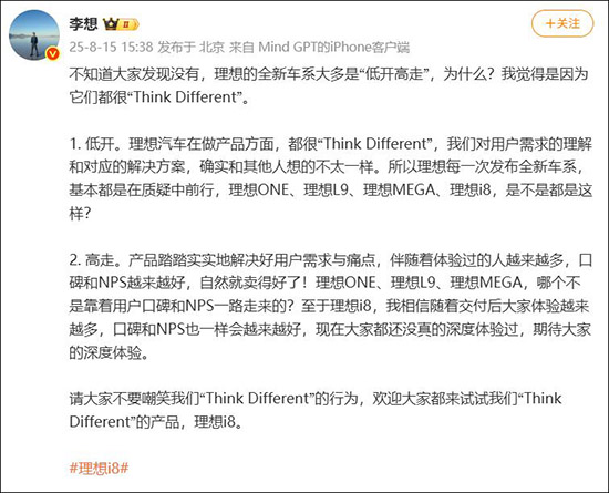 8月15日,理想汽车CEO李想在微博发文谈及了理想的全新车系大多是“低开高走”的原因是,它们都很“Think Different”(非同凡想)。