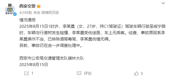 快科技消息,西安交警发布情况通报,就该市今日凌晨发生的一起单方面汽车事故进行公告。2025年8月15日1时许,李某晨(女,27岁,持C1驾驶证)驾驶车辆行驶至咸宁路时,车辆与行道树发生碰撞,李某晨受伤送医,车上无乘客。