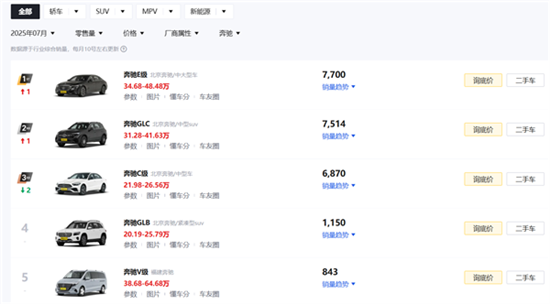 具体到车型来看,目前奔驰在国内的热销车型只剩下E级、GLC和C级三款。其中,奔驰E级7月销量为7700辆、奔驰GLC为7514辆、奔驰C级为6870辆。