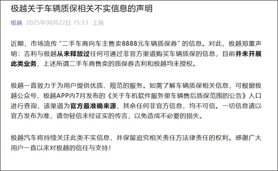8月22日,极越发布关于车辆质保相关不实信息的声明。