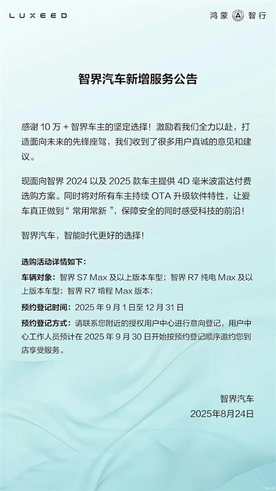 此次服务的车辆对象涵盖智界S7 Max及以上版本车型、智界R7纯电Max及以上版本车型,以及智界R7增程Max版本。