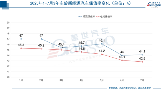 今年以来,价格战有增不减,新车此起彼伏,零公里二手车成为舆论焦点,行业内卷被官方提上休整日程……这些因素共同影响了新能源汽车今年上半年保值表现。根据中国汽车流通协会数据,2025年1至7月,三年车龄的新能源汽车保值率呈现缓慢下滑趋势。整体来看,插电式混合动力车型三年保值率略高于纯电动车型,今年7月,插电式混合动力车型三年保值率为44.1%,纯电动车型则为44.8%。