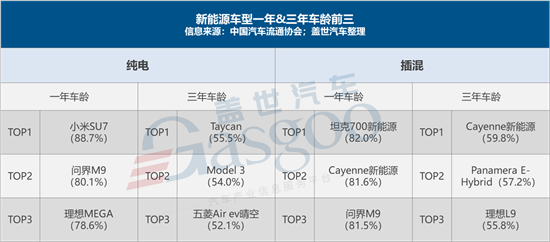 另外,不同车龄段保值率也有着明显的特征差异。一年车龄榜单常被技术新、热度高的车型主导,如小米SU7、问界M9等。而三年车龄保值率则更考验车型长期价值,在纯电动领域,豪华品牌保时捷Taycan、经典电车特斯拉Model 3以及定位精准的经济型小车五菱Air ev晴空表现更为坚挺;插混领域则由保时捷Cayenne新能源、Panamera E-Hybrid和理想L9等高端车型领跑。