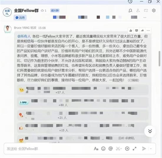 他还称,鼓励大家向身边BBA的用户主动推荐蔚来,这是管理销售的红线。